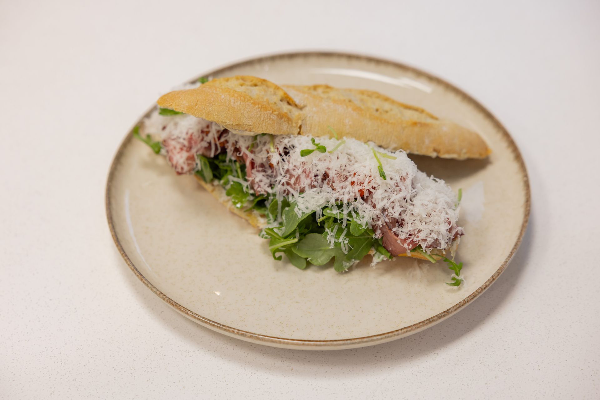 Roast beef | Thinly sliced roast beef with truffle mayonnaise, sundried tomatoes, lettuce and Parmesan cheese