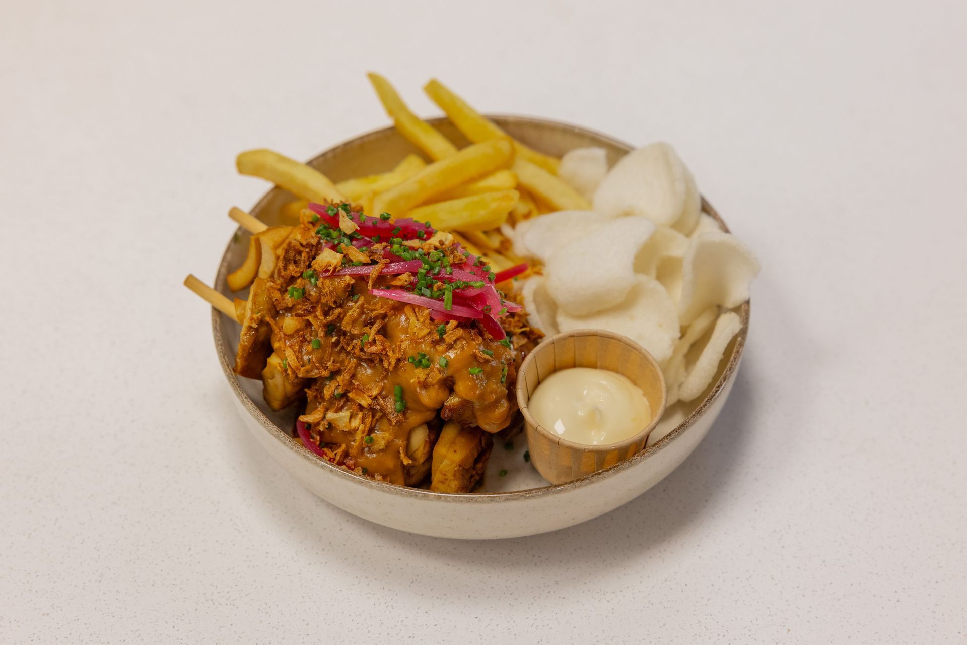 Kip kerrie | kipdij met kerriesaus, zoetzure groenten en chilimayonaise