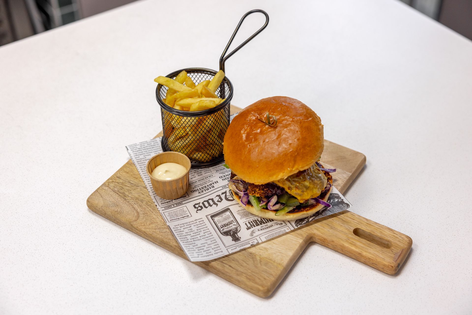 Kip burger | huisgemaakte krokante kipdij met yakitorisaus, gefrituurde uienringen, cheddar, coleslaw en tomaat