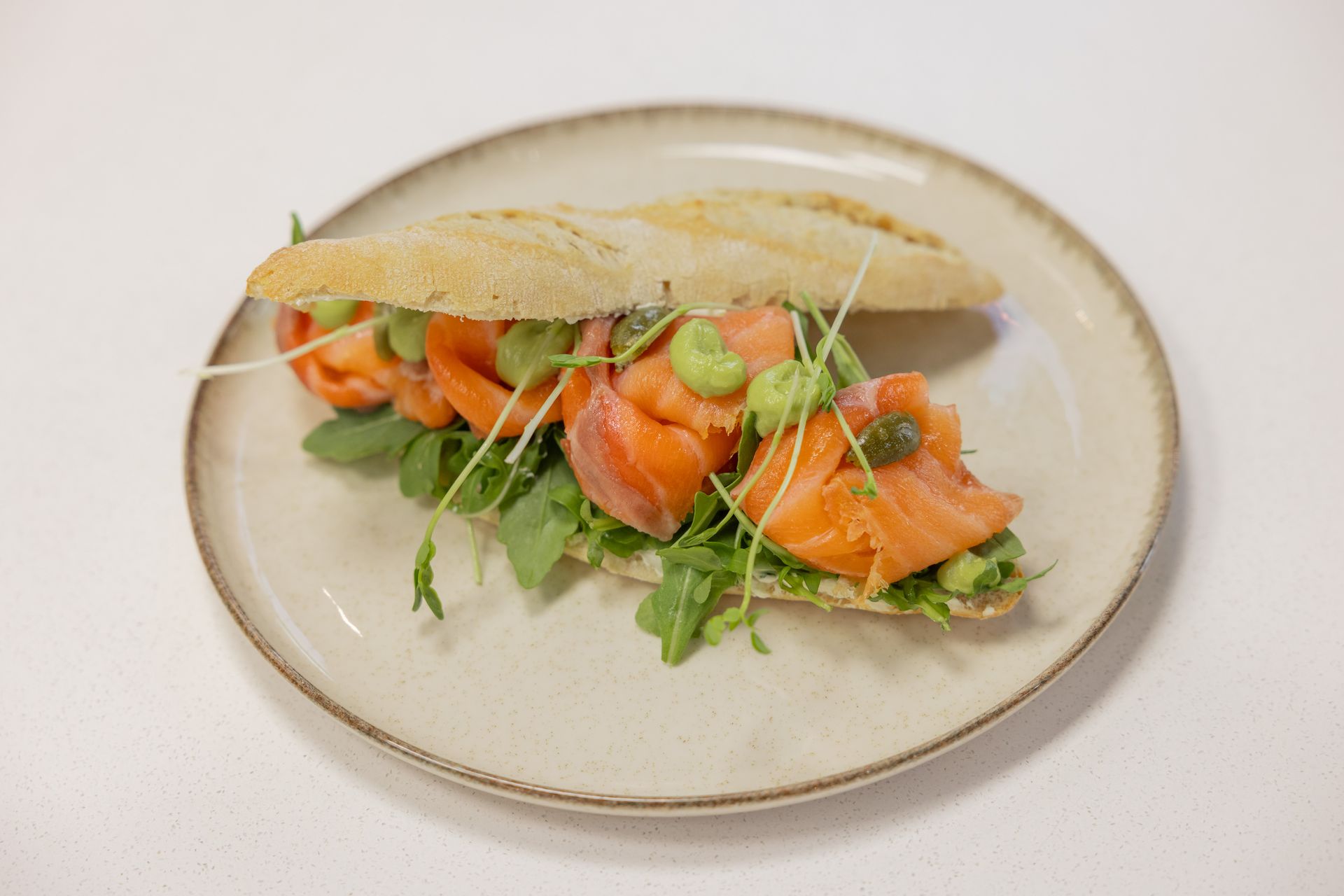 Salmon salad | smoked salmon, creamy avocado dressing on a soft base, finished with dill cream and sweet and sour vegetables